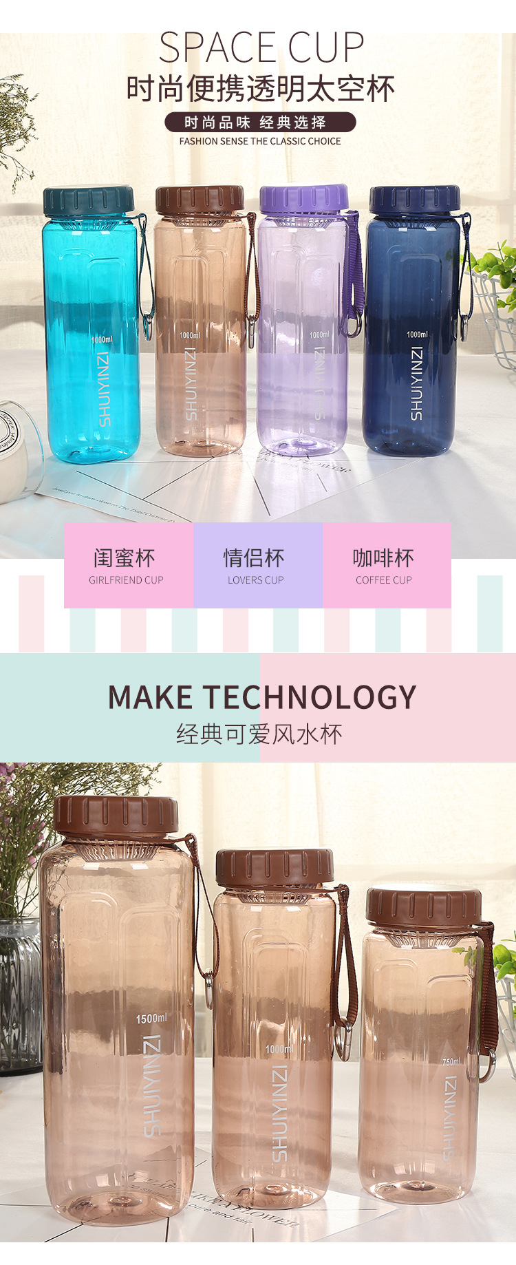 太空杯便携水杯塑料学生水壶 简约随手杯直身透明太空杯厂家批发