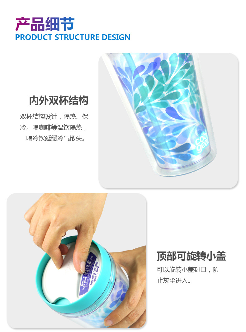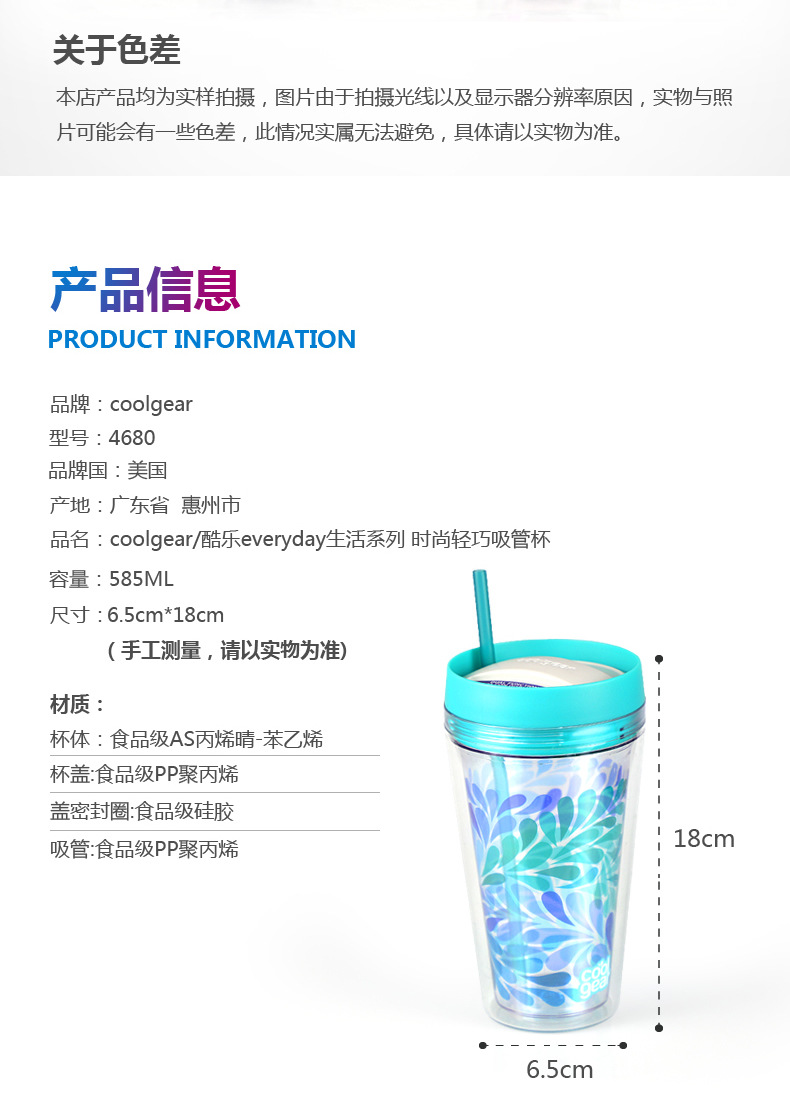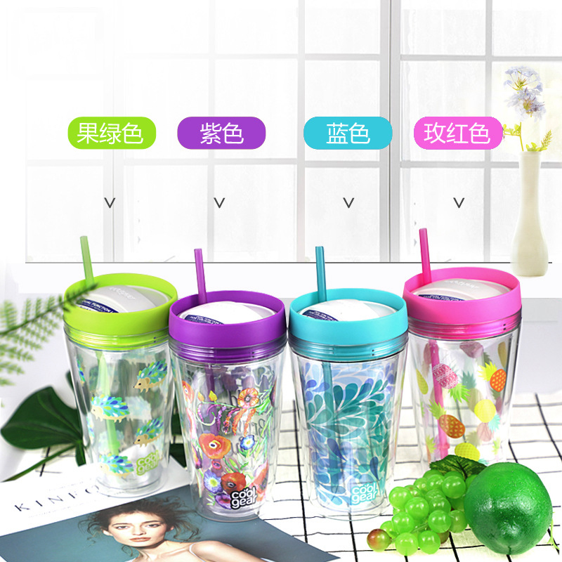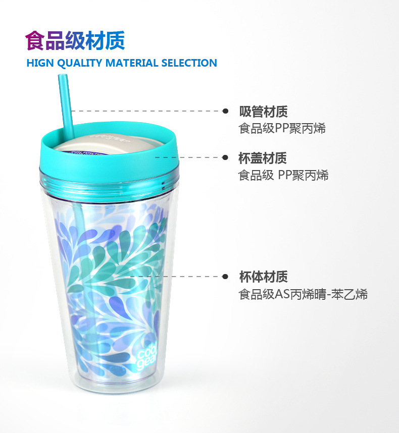 coolgear美国双层咖啡杯 时尚轻巧吸管杯创意喝水杯家用女透明简约