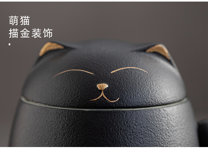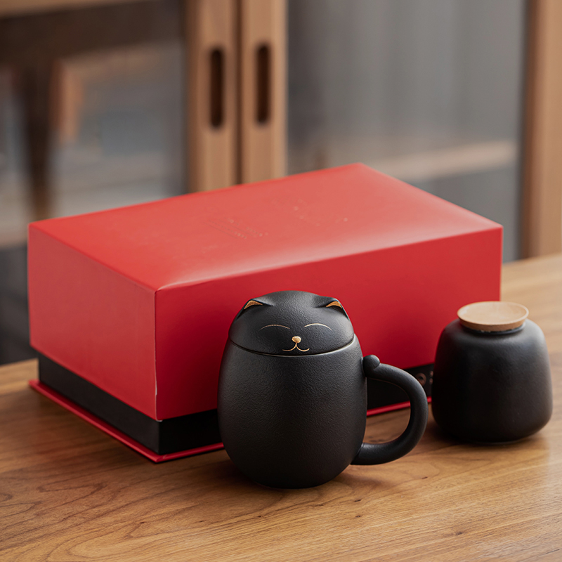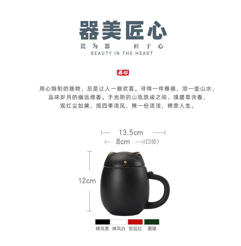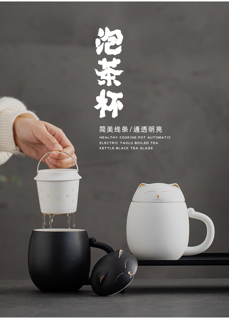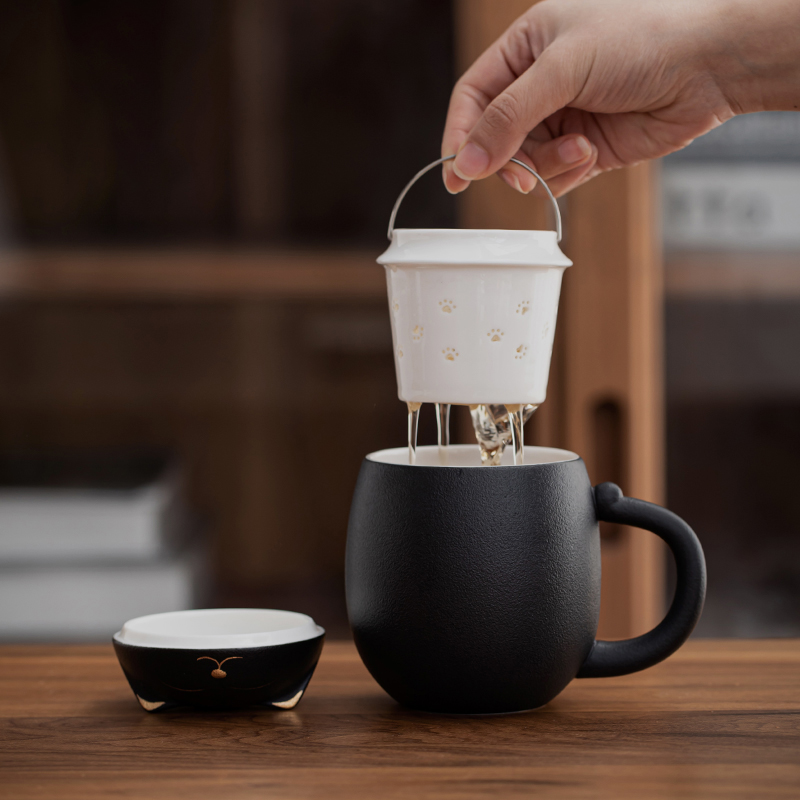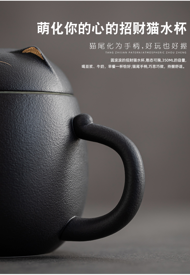 招财猫办公室泡茶杯 陶瓷过滤茶杯带盖 茶水分离家用喝茶水杯