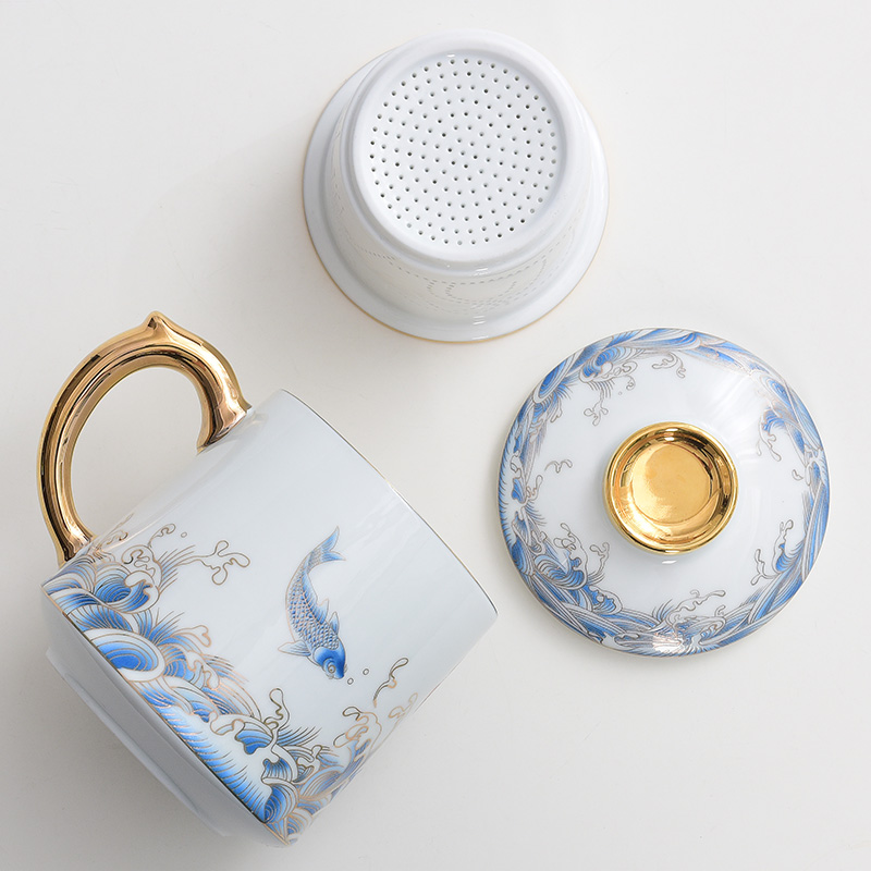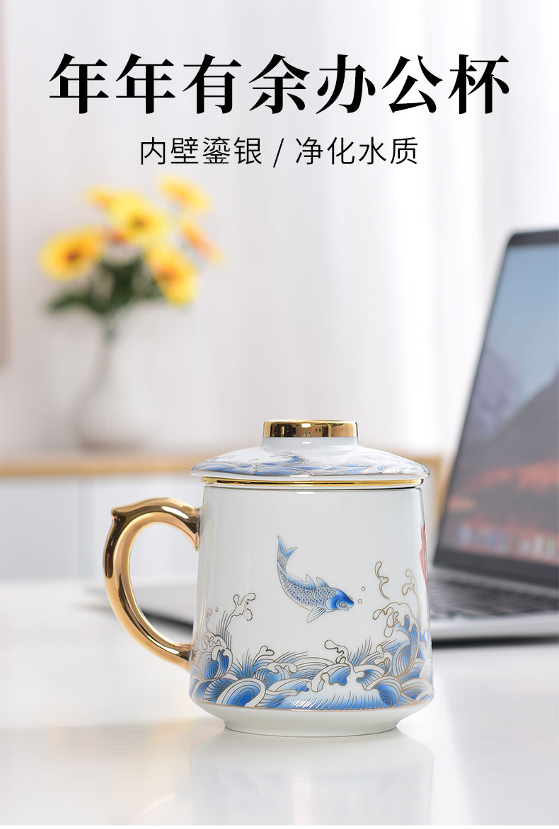 变色青花瓷杯子马克杯带茶漏泡茶过滤杯银水杯999纯银骨瓷办公室茶杯