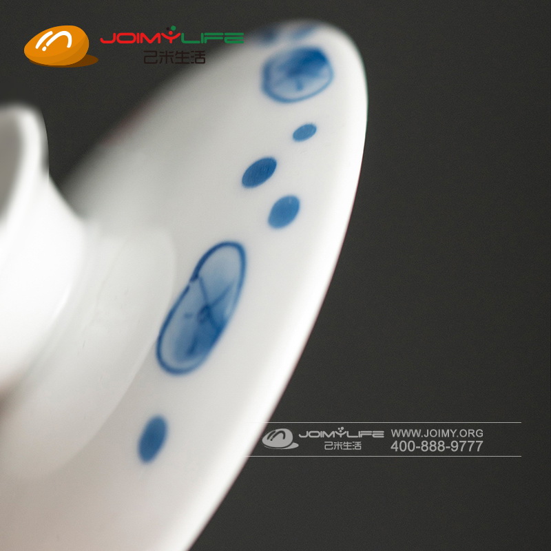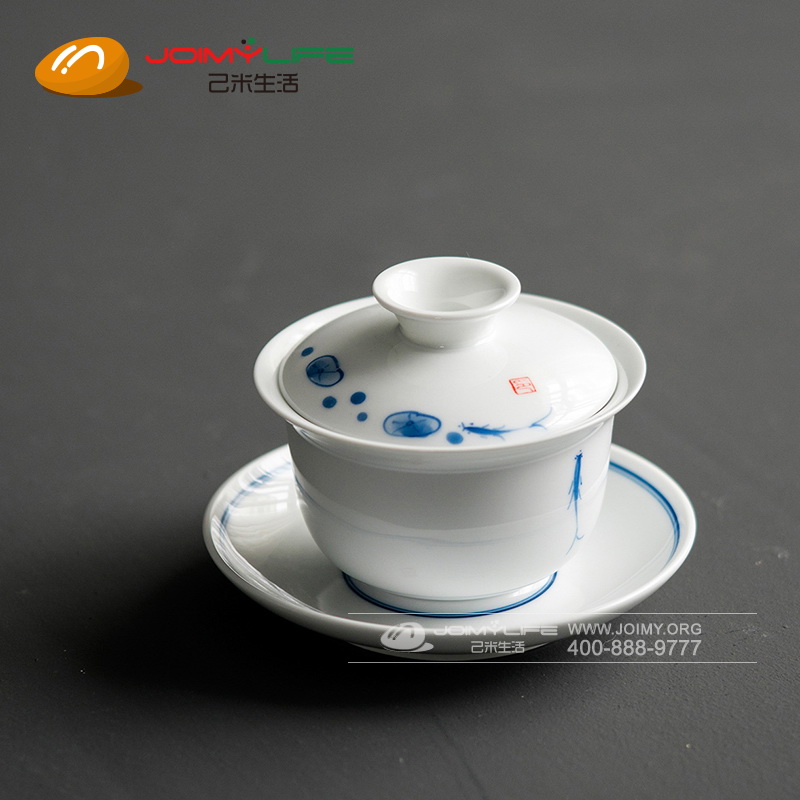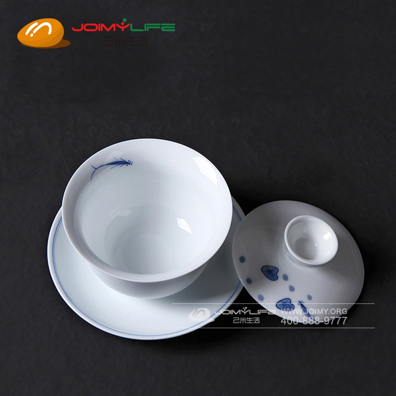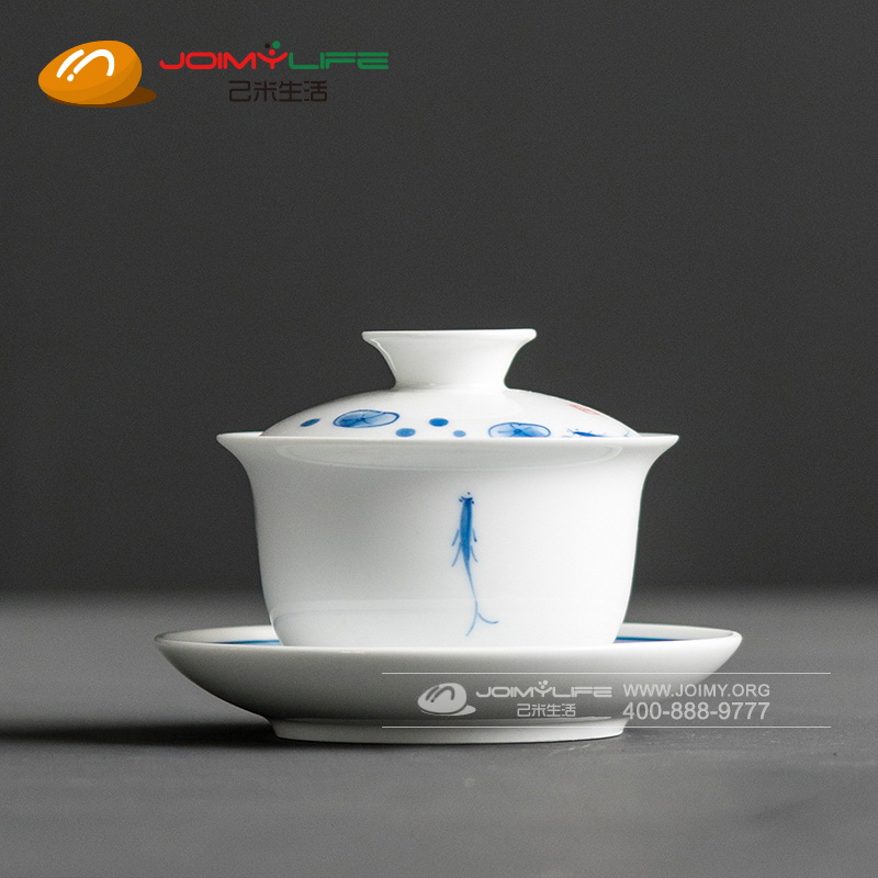 景德镇青花手绘甜白三鱼图盖碗 白瓷手绘三才泡茶碗 功夫茶具定制