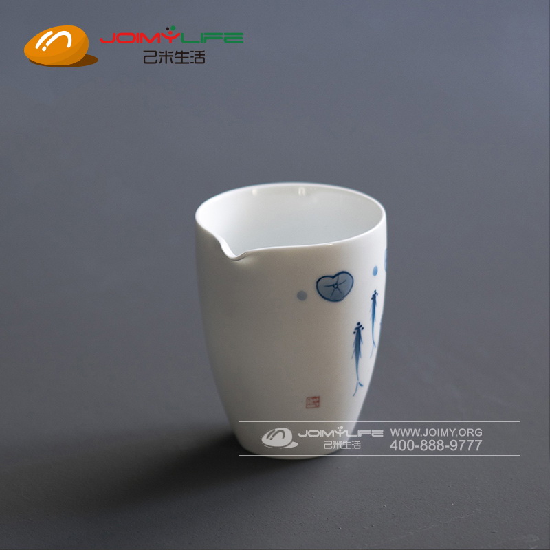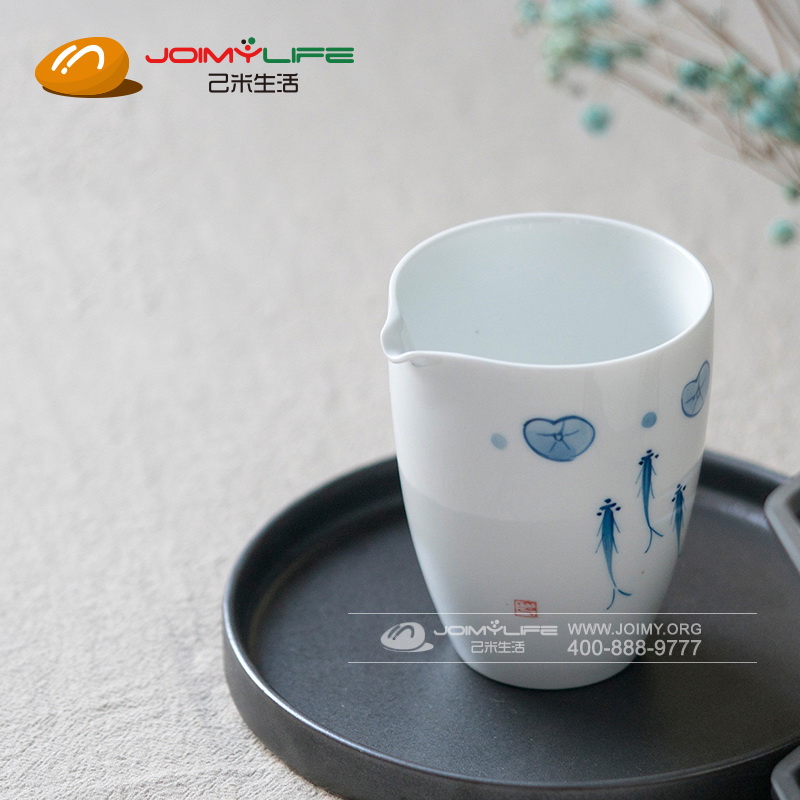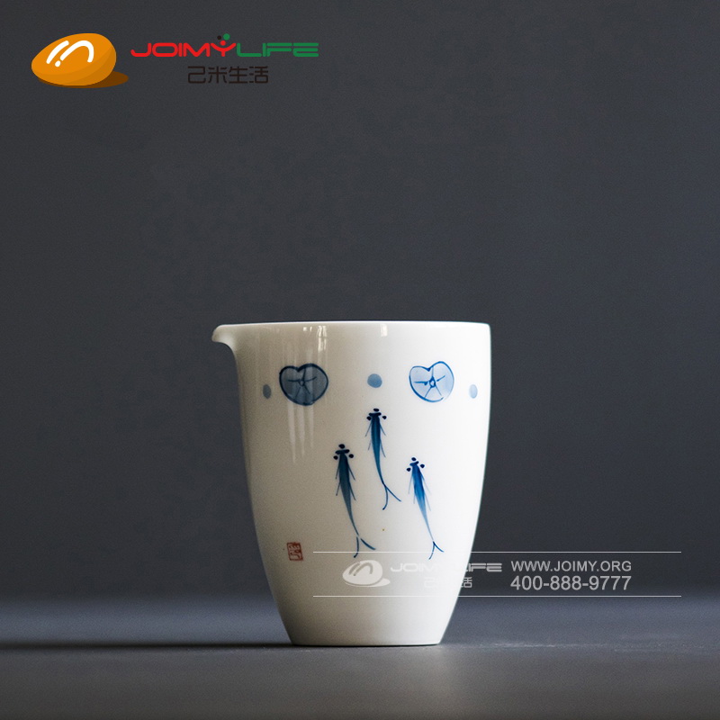 景德镇手绘蓝彩鱼戏荷塘公道杯 陶瓷茶具定制