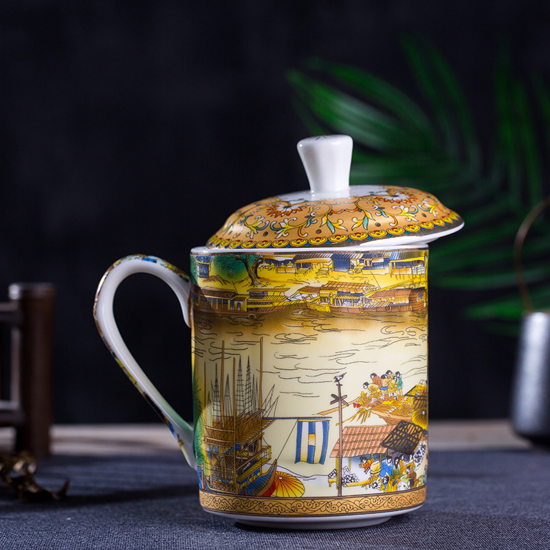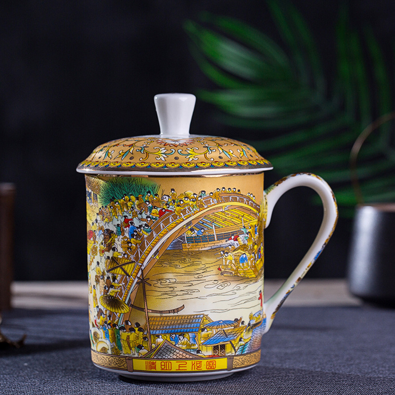 景德镇清明上河图骨瓷茶杯定制 骨瓷杯大号商务办公礼品会议杯LOGO定制