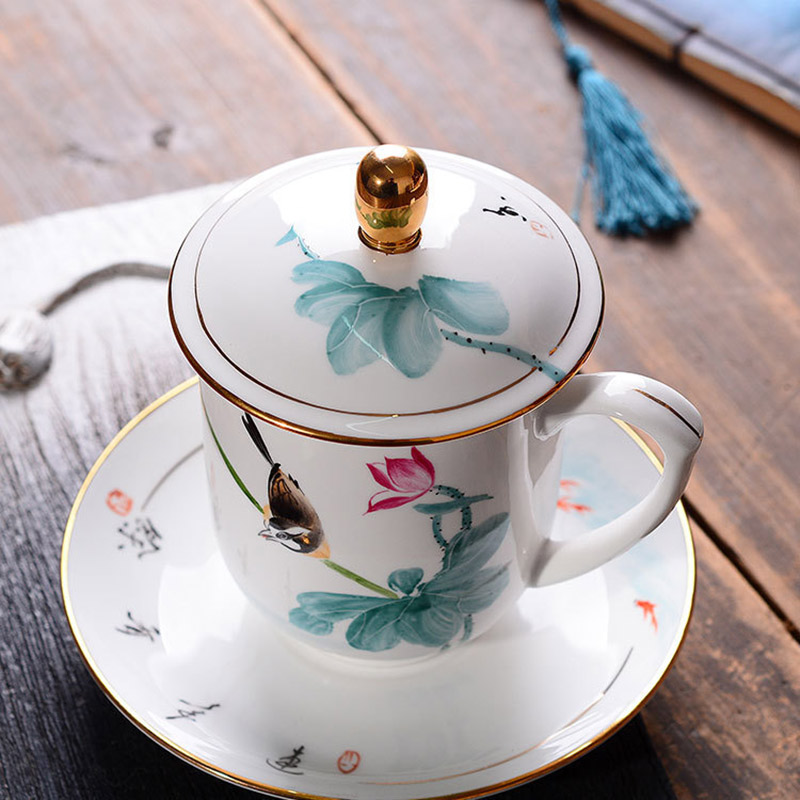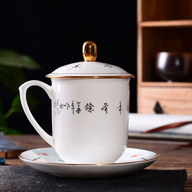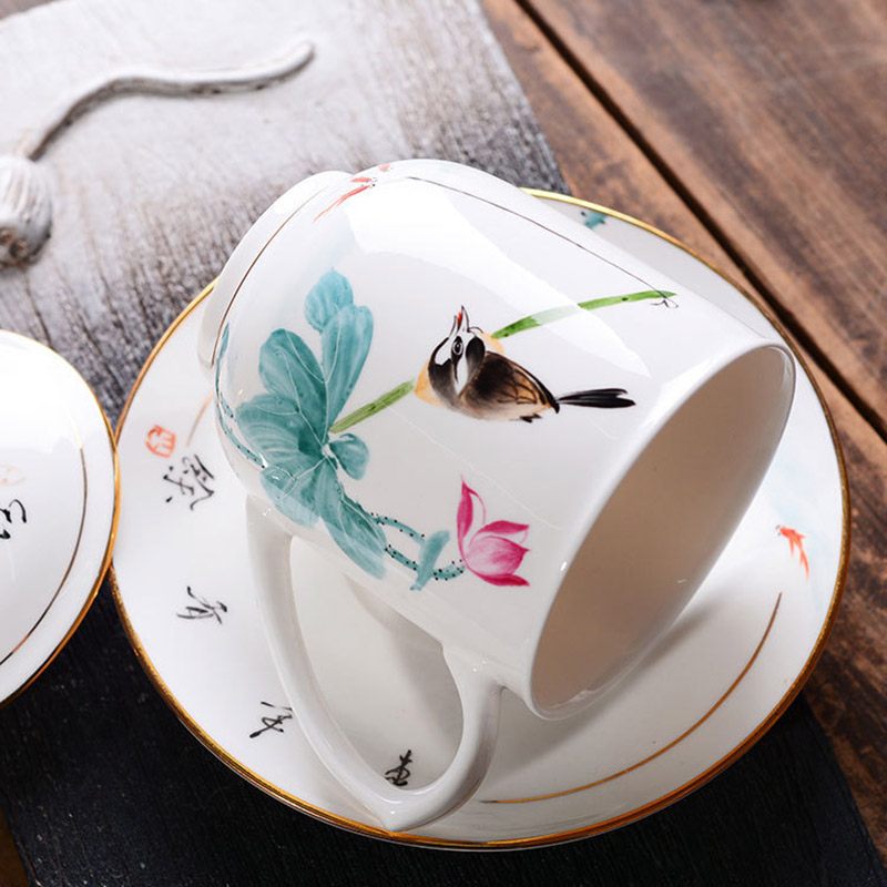 景德镇高温陶瓷茶杯定制 带盖带托碟手绘骨质瓷办公会议杯logo定制批发