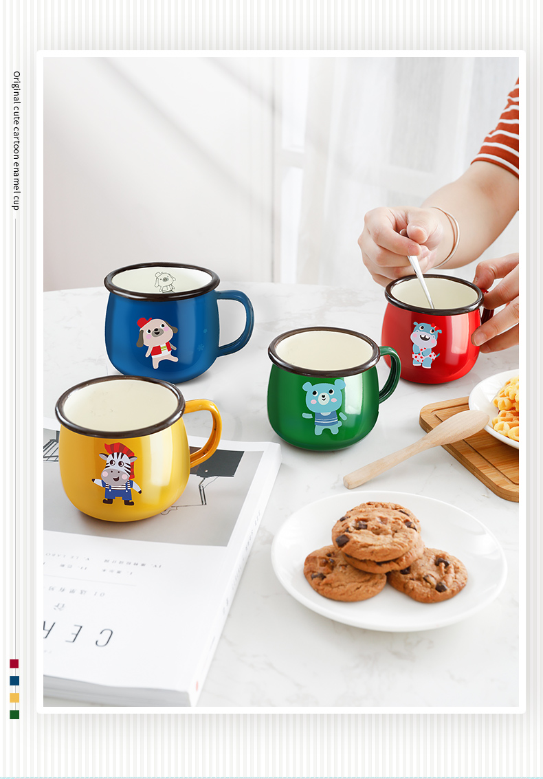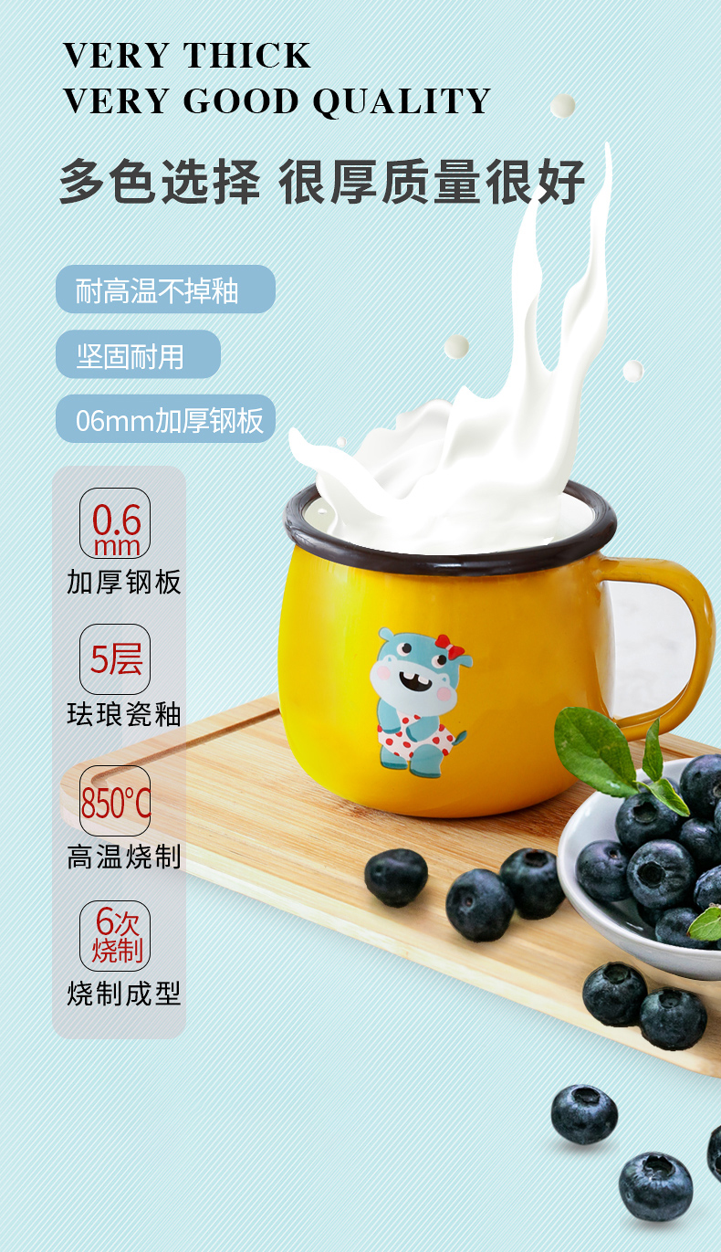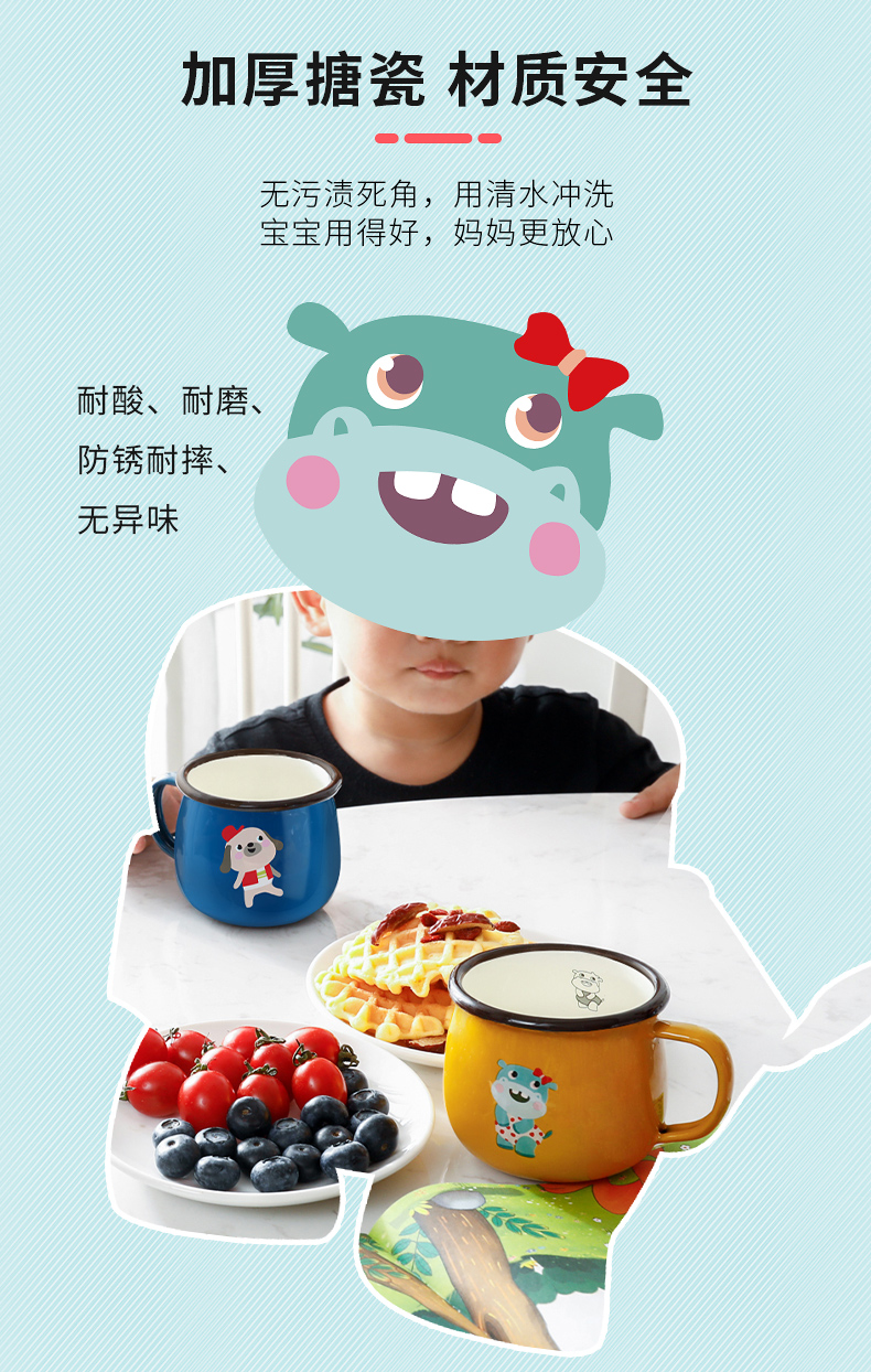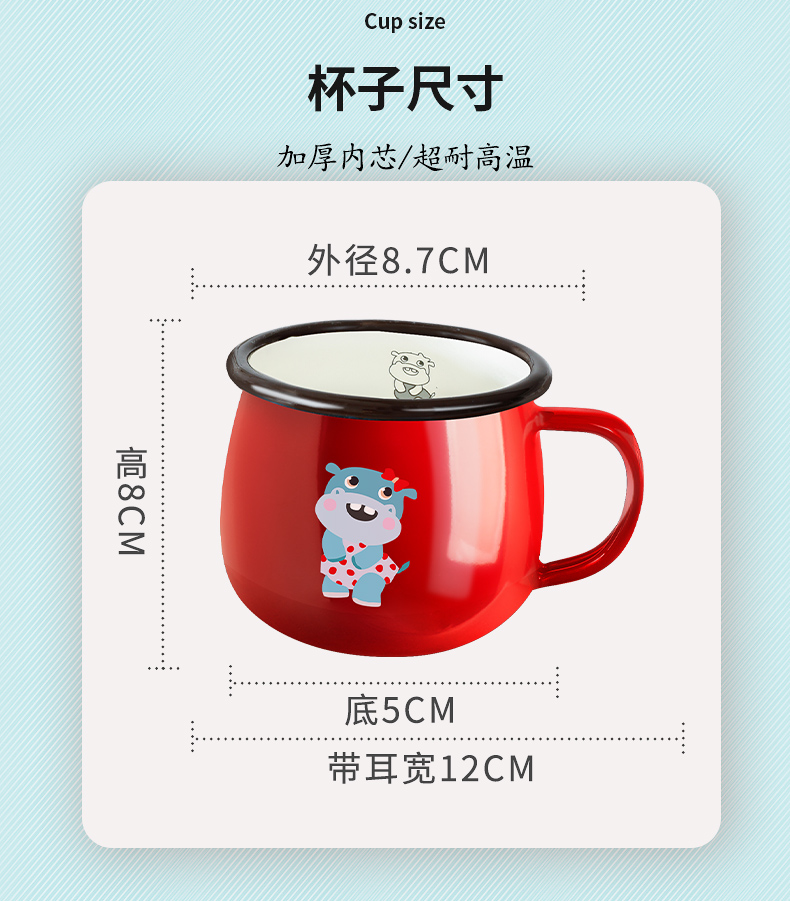 搪瓷杯儿童牛奶杯 卡通刻度防摔喝水杯 家用宝宝带盖搪瓷杯子