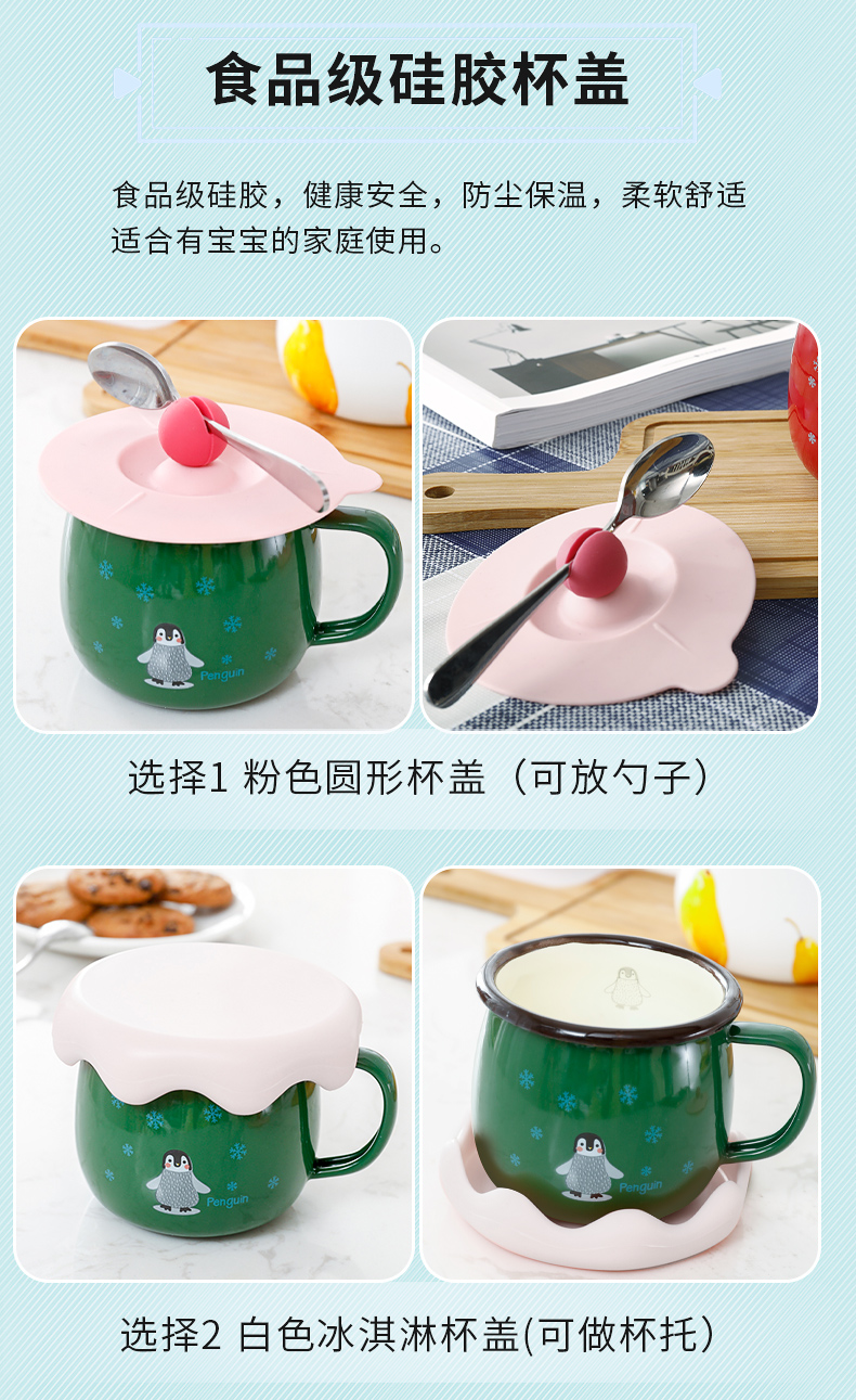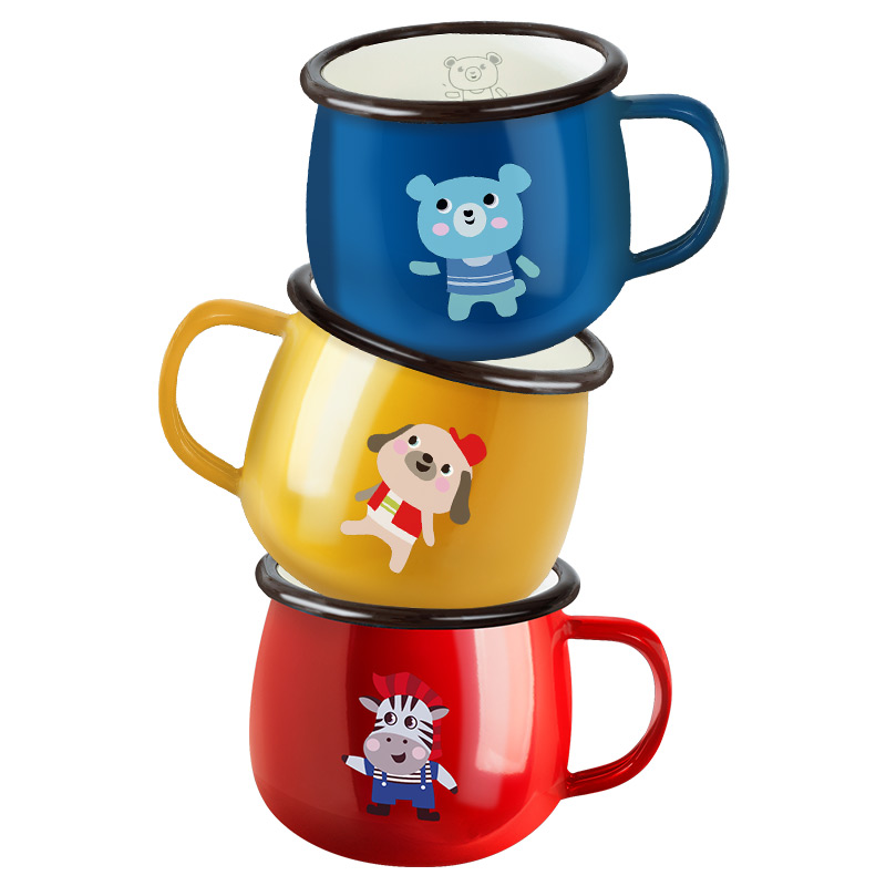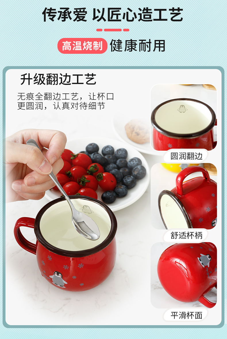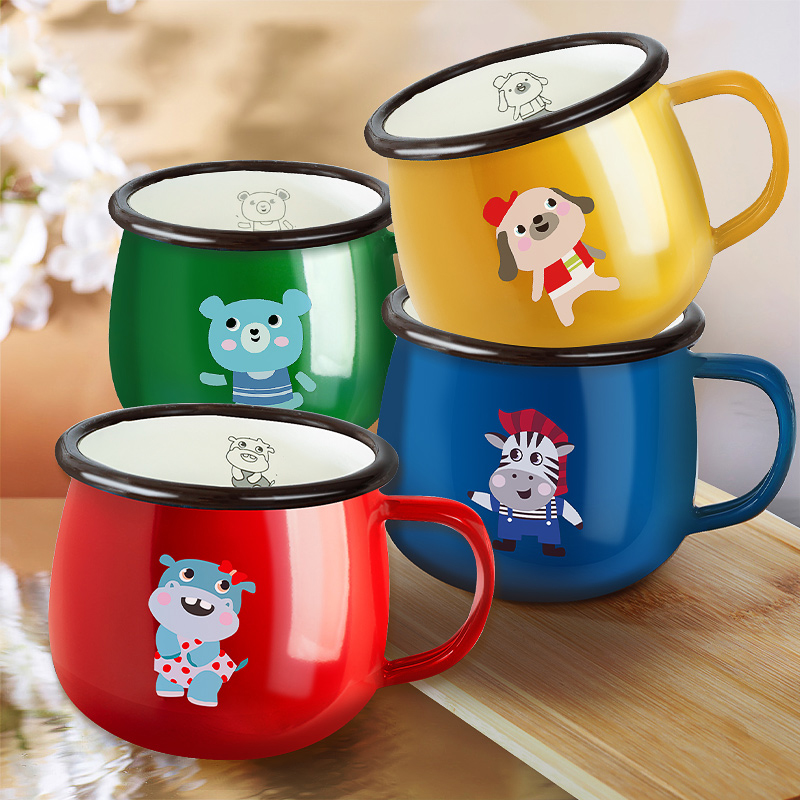 搪瓷杯儿童牛奶杯 卡通刻度防摔喝水杯 家用宝宝带盖搪瓷杯子
