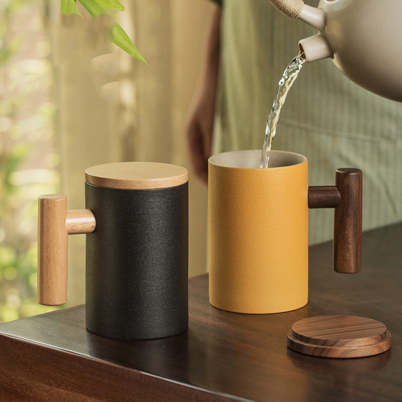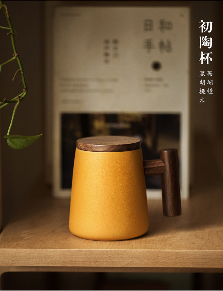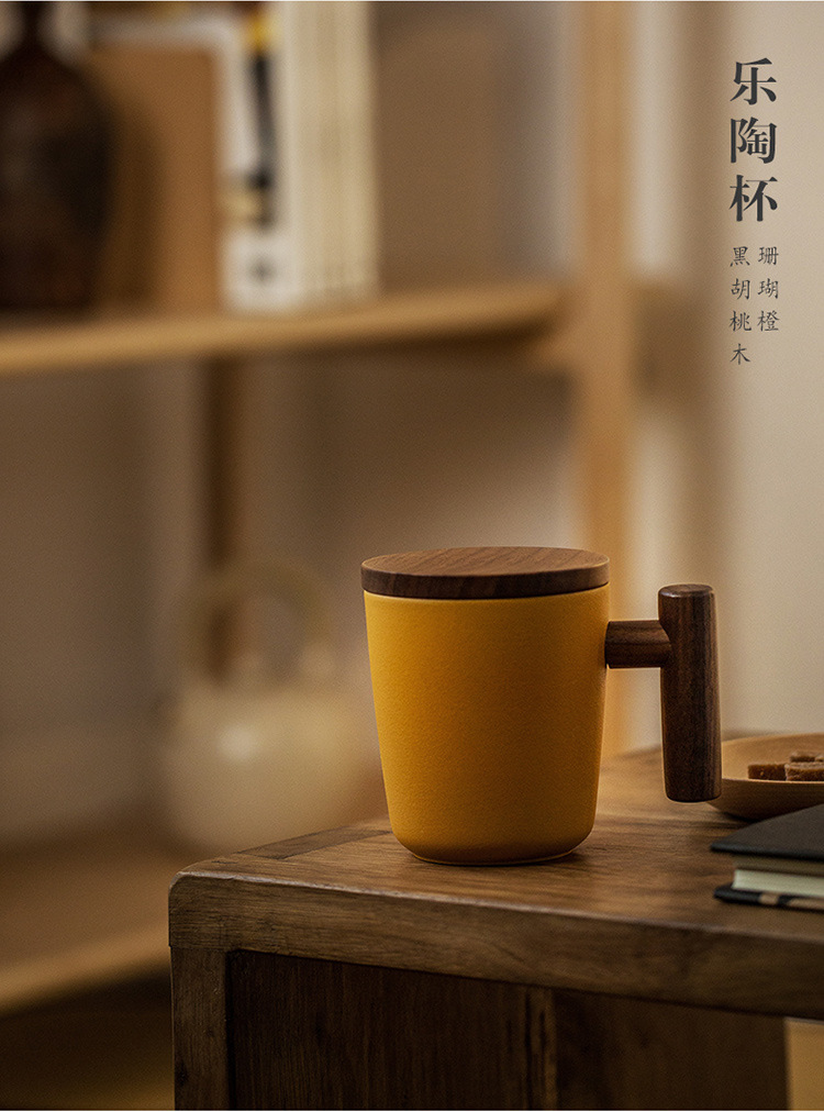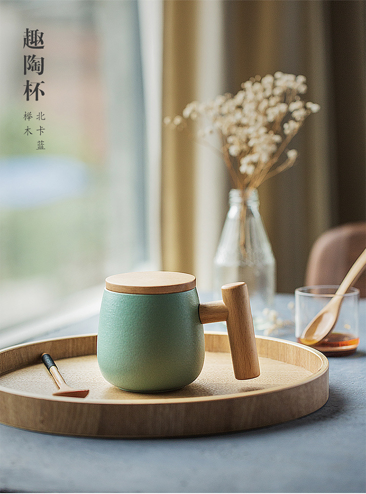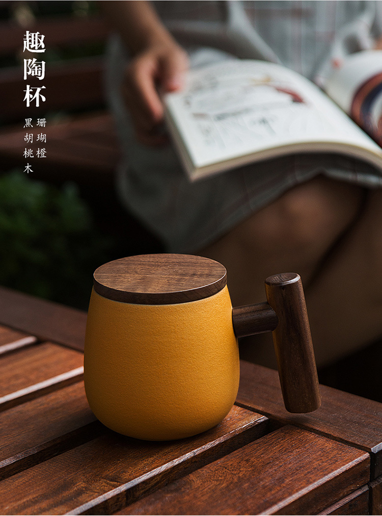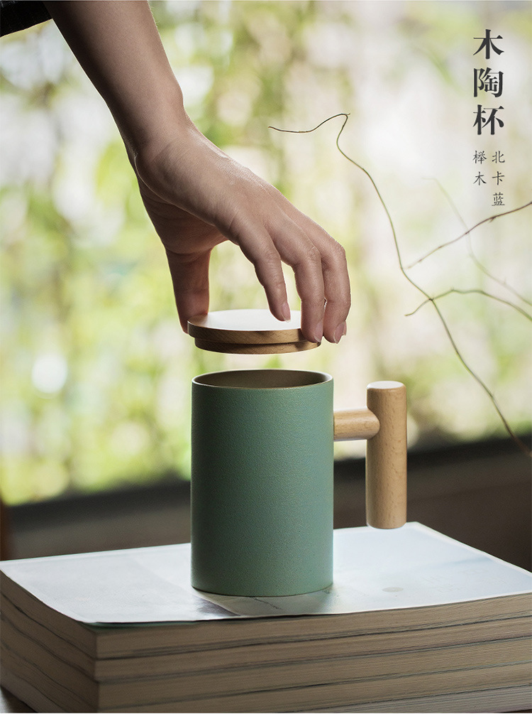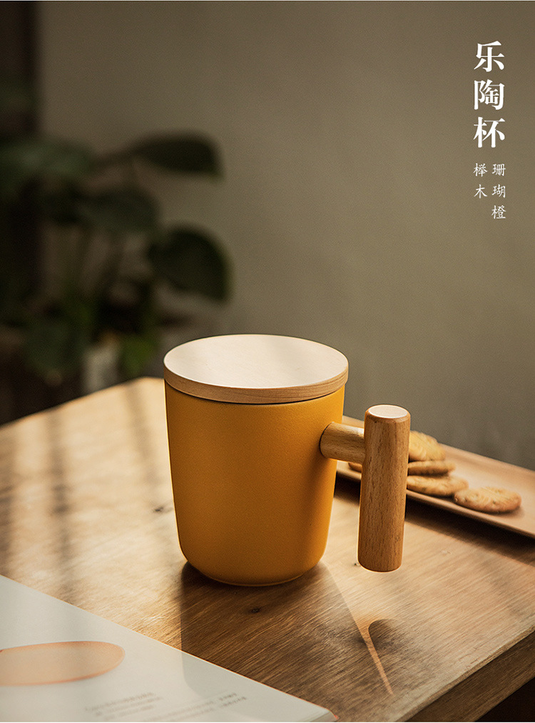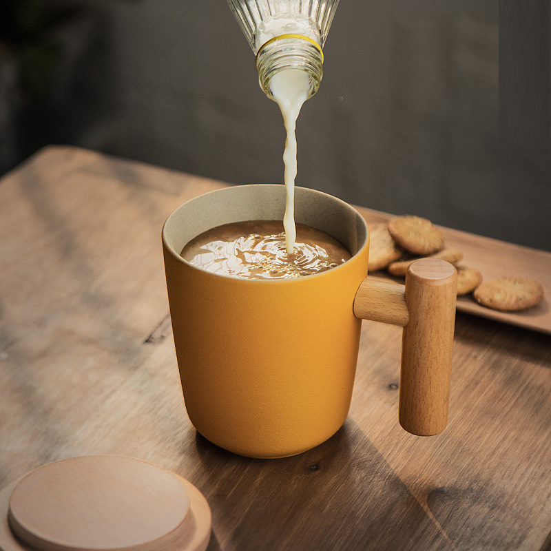 彩色陶瓷耐高温牛奶杯木把带盖办公室休闲家居泡茶咖啡杯