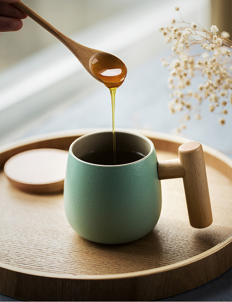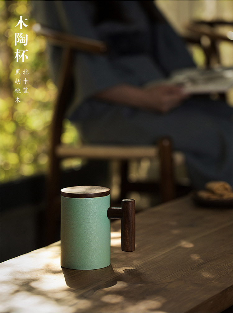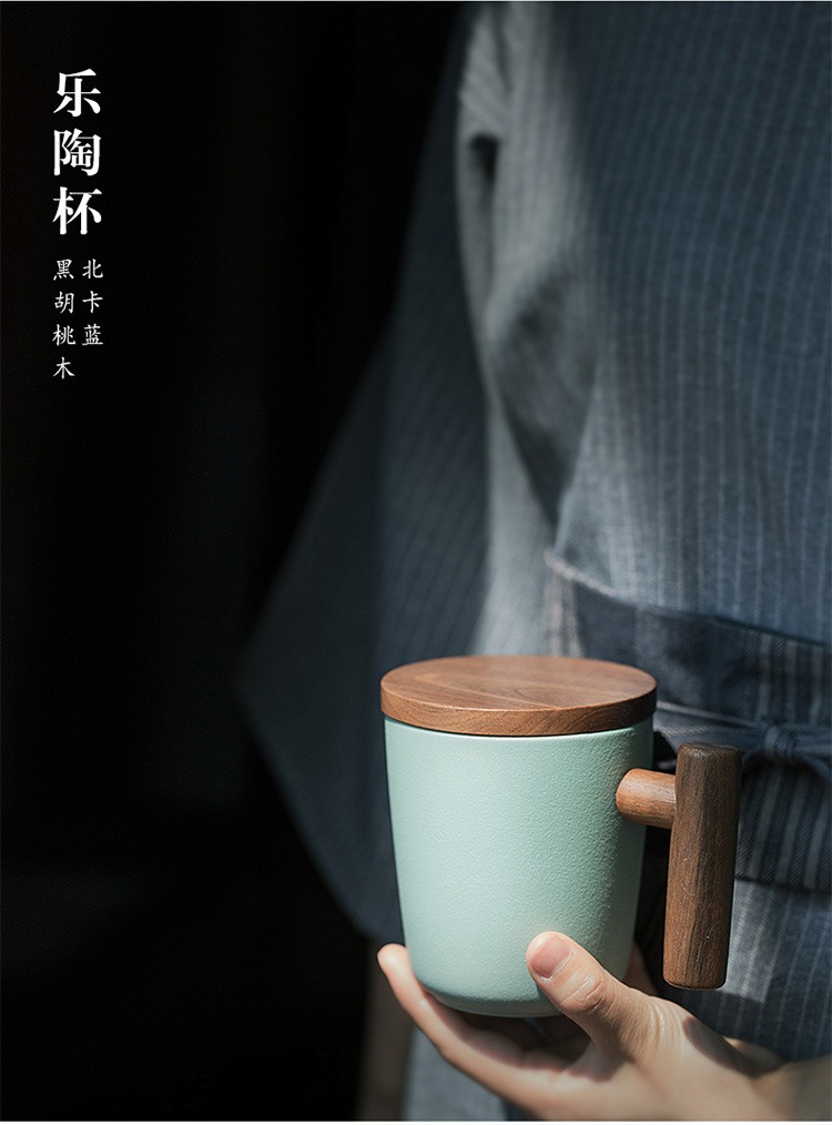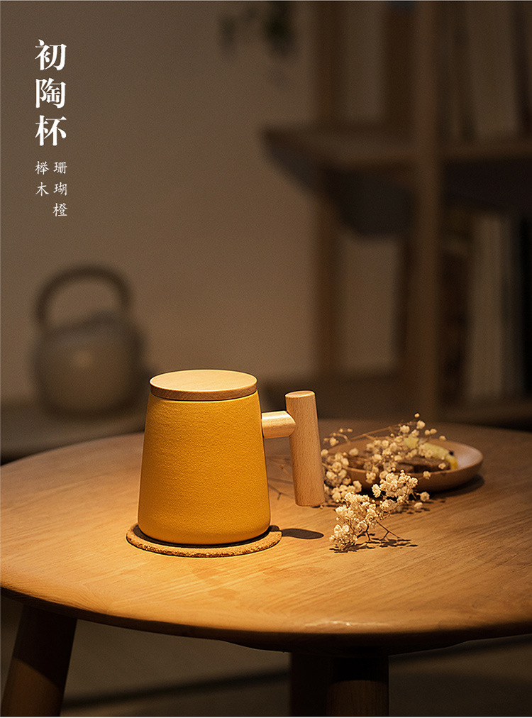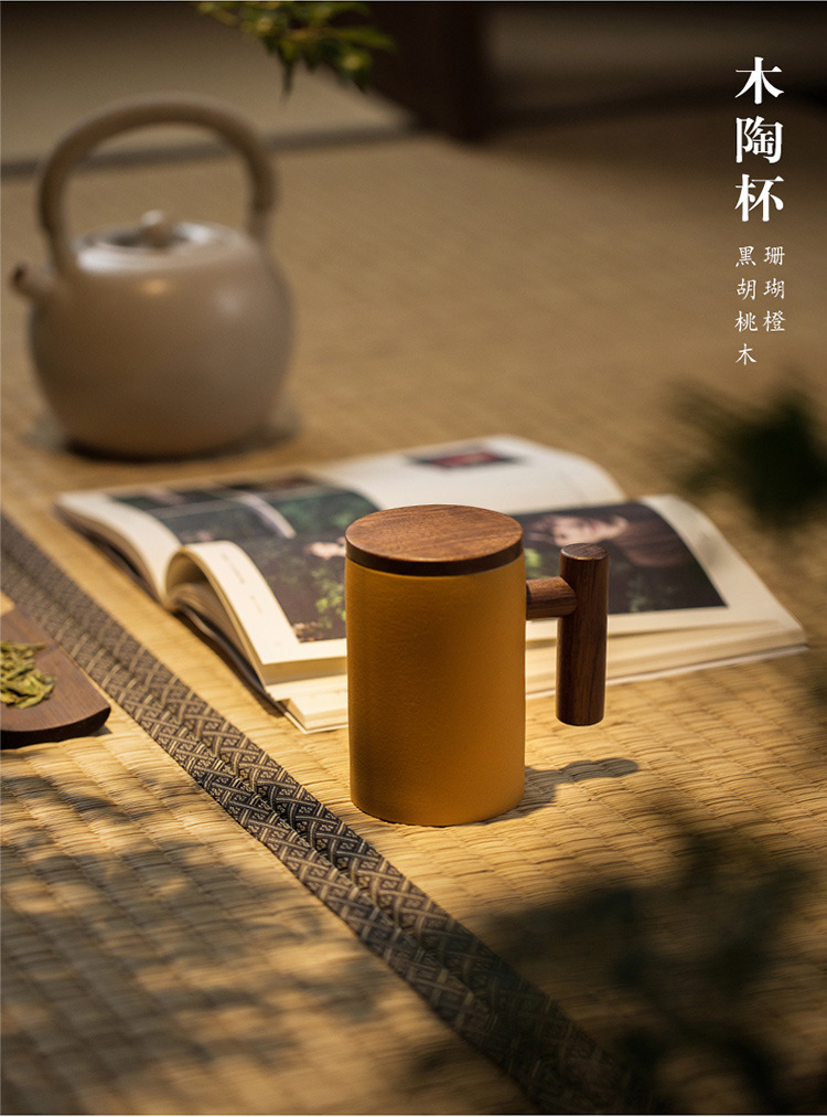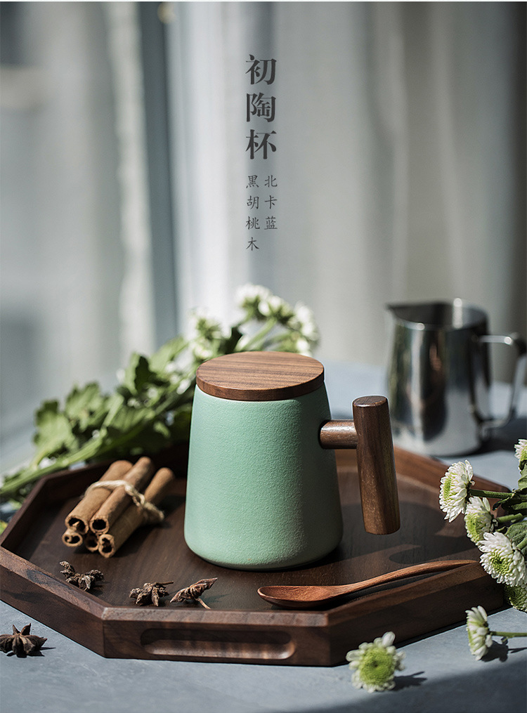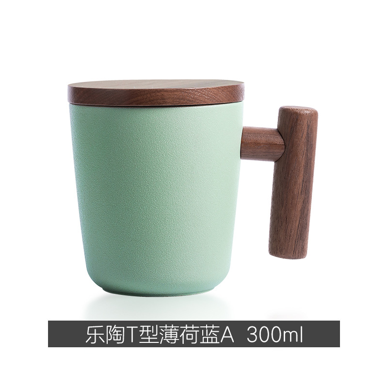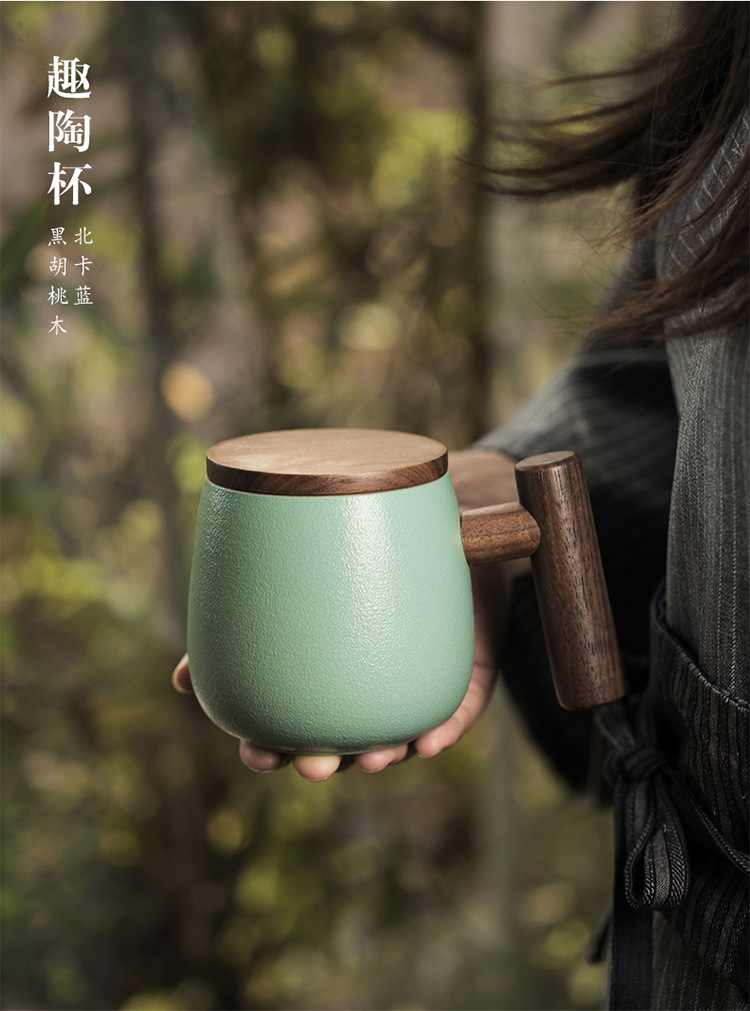 彩色陶瓷耐高温牛奶杯木把带盖办公室休闲家居泡茶咖啡杯
