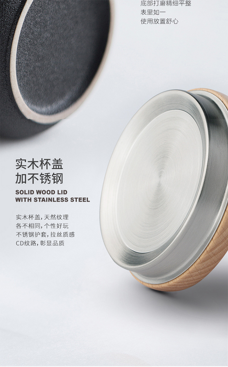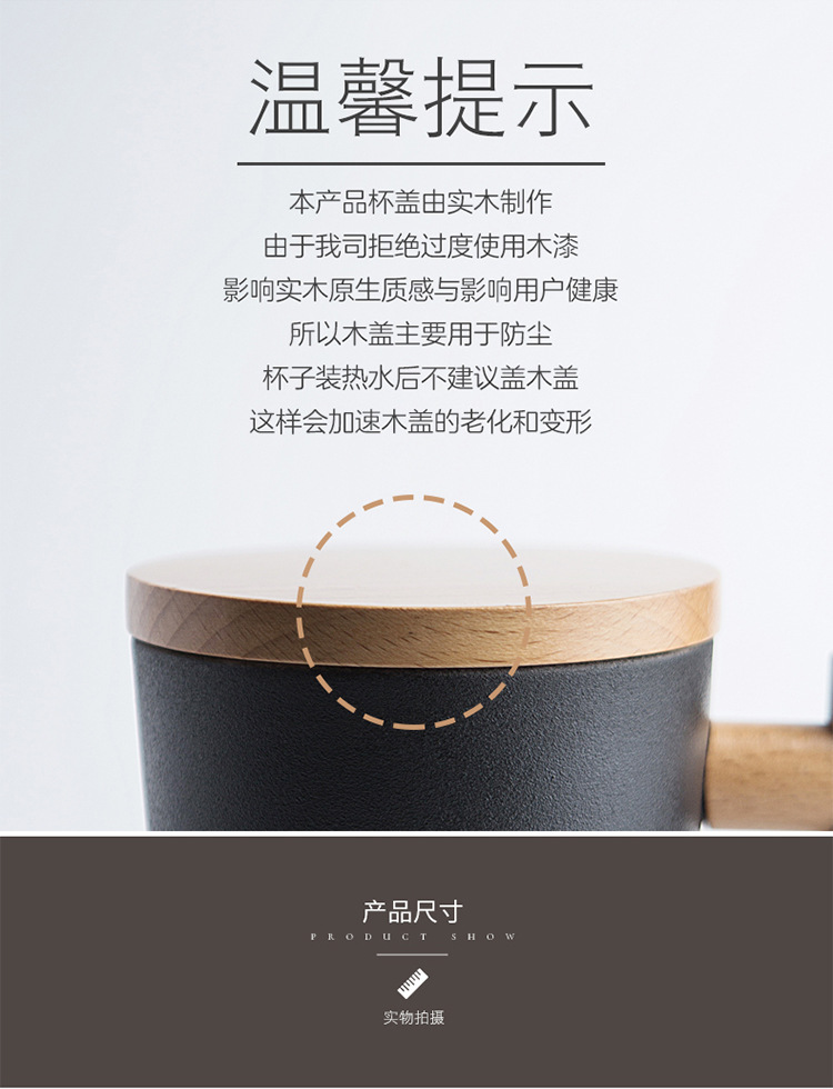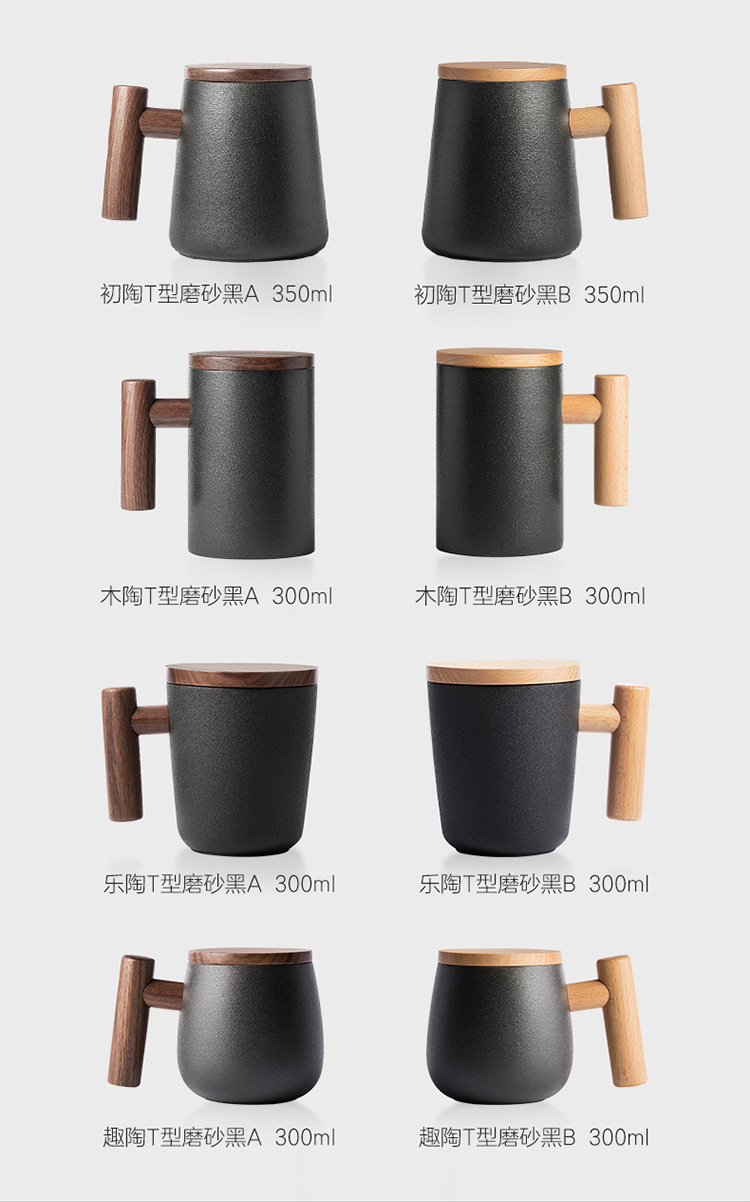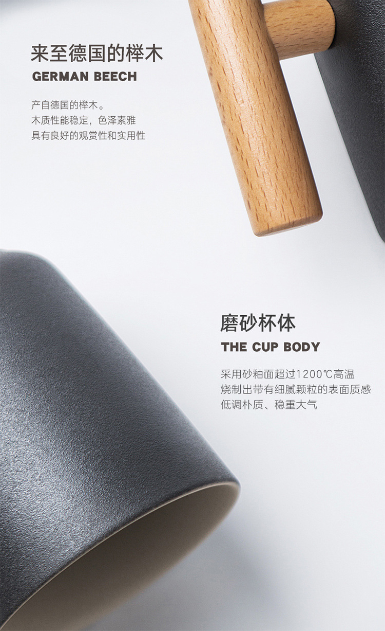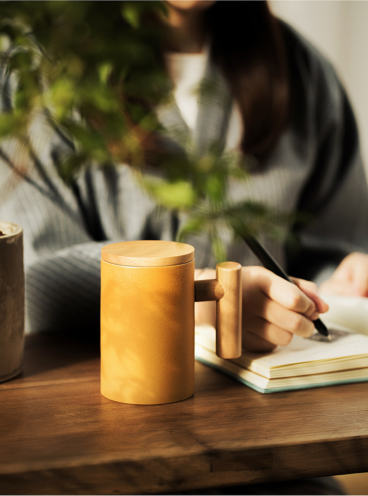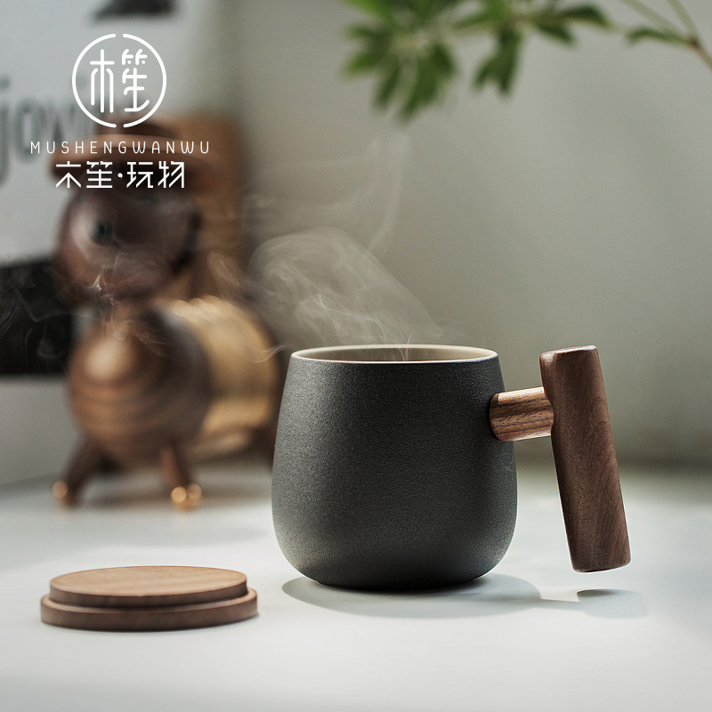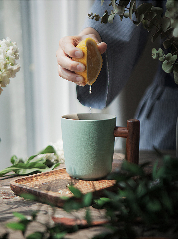 彩色陶瓷耐高温牛奶杯木把带盖办公室休闲家居泡茶咖啡杯